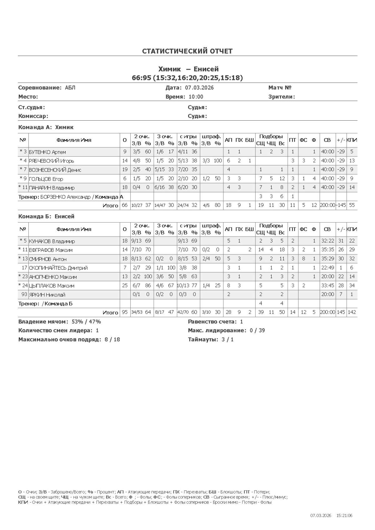 О — очки; О2 — 2-очковые (попадания/броски, %); О3 — 3-очковые; ОШ — штрафные; АП — ассисты; ПХ — перехваты; БШ — блокшоты; СЩ — подборы свой щит; ЧЩ — подборы чужой щит; ПТ — потери; Ф — фолы; ФС — фолы соперников; СВ — сыграно времени (мм:сс); +/- — плюс-минус (разница очков команды, когда игрок был на площадке); КПИ — коэффициент полезности (очки + подборы + ассисты + перехваты + блокшоты + ФС − Ф − промахи − потери).