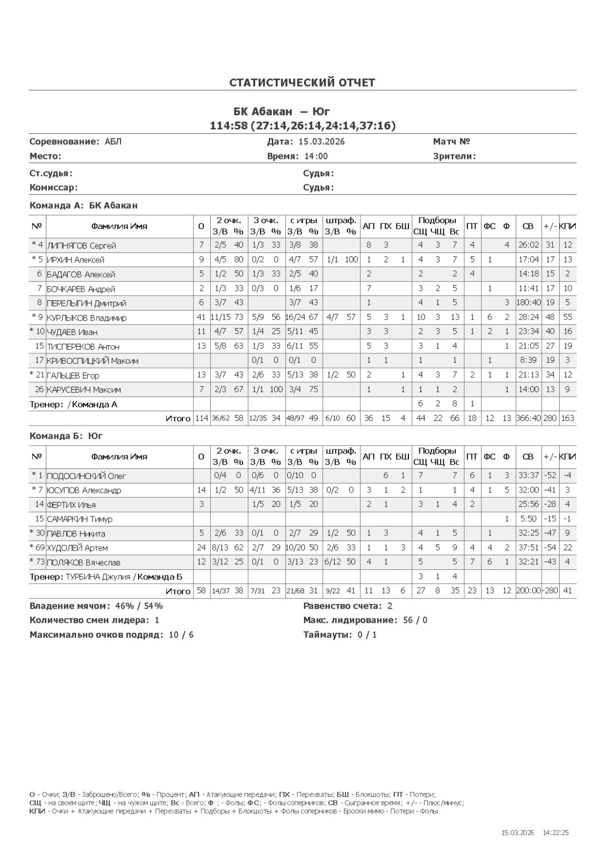 О — очки; О2 — 2-очковые (попадания/броски, %); О3 — 3-очковые; ОШ — штрафные; АП — ассисты; ПХ — перехваты; БШ — блокшоты; СЩ — подборы свой щит; ЧЩ — подборы чужой щит; ПТ — потери; Ф — фолы; ФС — фолы соперников; СВ — сыграно времени (мм:сс); +/- — плюс-минус (разница очков команды, когда игрок был на площадке); КПИ — коэффициент полезности (очки + подборы + ассисты + перехваты + блокшоты + ФС − Ф − промахи − потери).