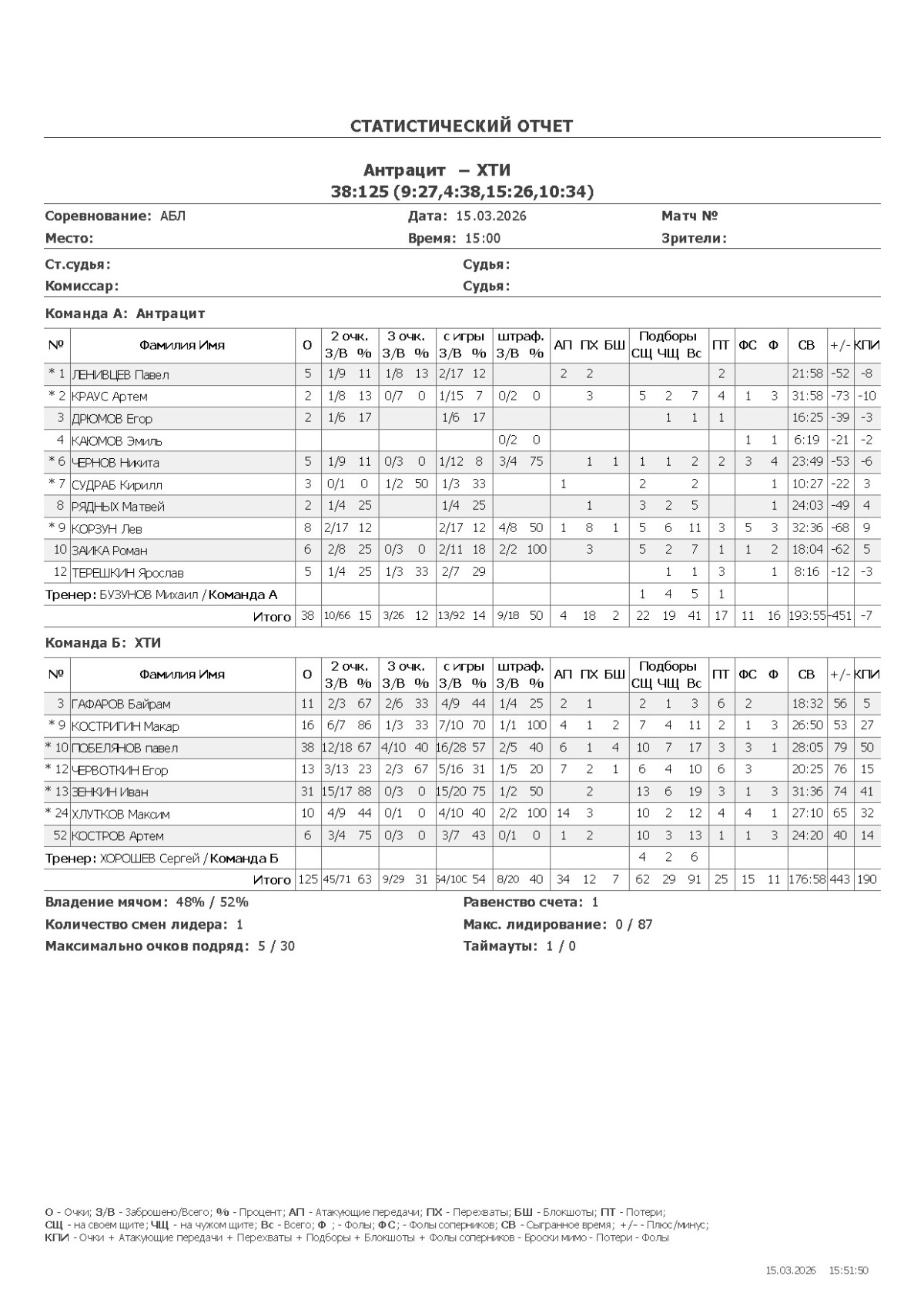 О — очки; О2 — 2-очковые (попадания/броски, %); О3 — 3-очковые; ОШ — штрафные; АП — ассисты; ПХ — перехваты; БШ — блокшоты; СЩ — подборы свой щит; ЧЩ — подборы чужой щит; ПТ — потери; Ф — фолы; ФС — фолы соперников; СВ — сыграно времени (мм:сс); +/- — плюс-минус (разница очков команды, когда игрок был на площадке); КПИ — коэффициент полезности (очки + подборы + ассисты + перехваты + блокшоты + ФС − Ф − промахи − потери).