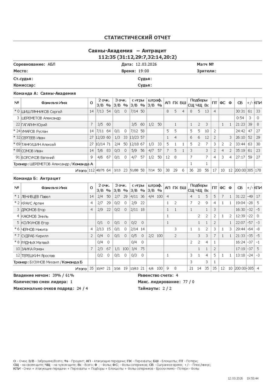 | Саяны-Академия | 31 | 29 | 32 | 20 | 112 |