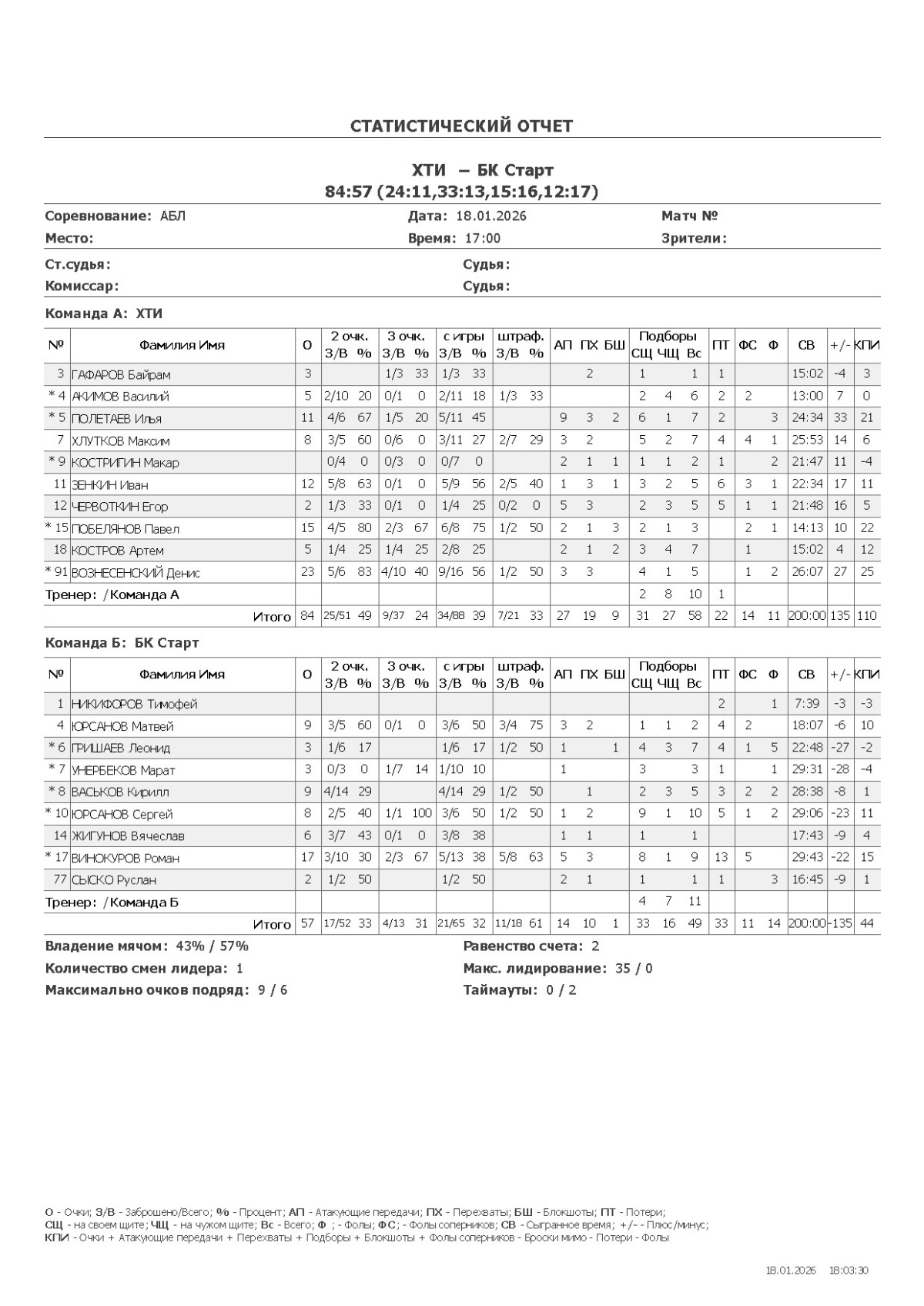 О — очки; О2 — 2-очковые (попадания/броски, %); О3 — 3-очковые; ОШ — штрафные; АП — ассисты; ПХ — перехваты; БШ — блокшоты; СЩ — подборы свой щит; ЧЩ — подборы чужой щит; ПТ — потери; Ф — фолы; ФС — фолы соперников; СВ — сыграно времени (мм:сс); +/- — плюс-минус (разница очков команды, когда игрок был на площадке); КПИ — коэффициент полезности (очки + подборы + ассисты + перехваты + блокшоты + ФС − Ф − промахи − потери).