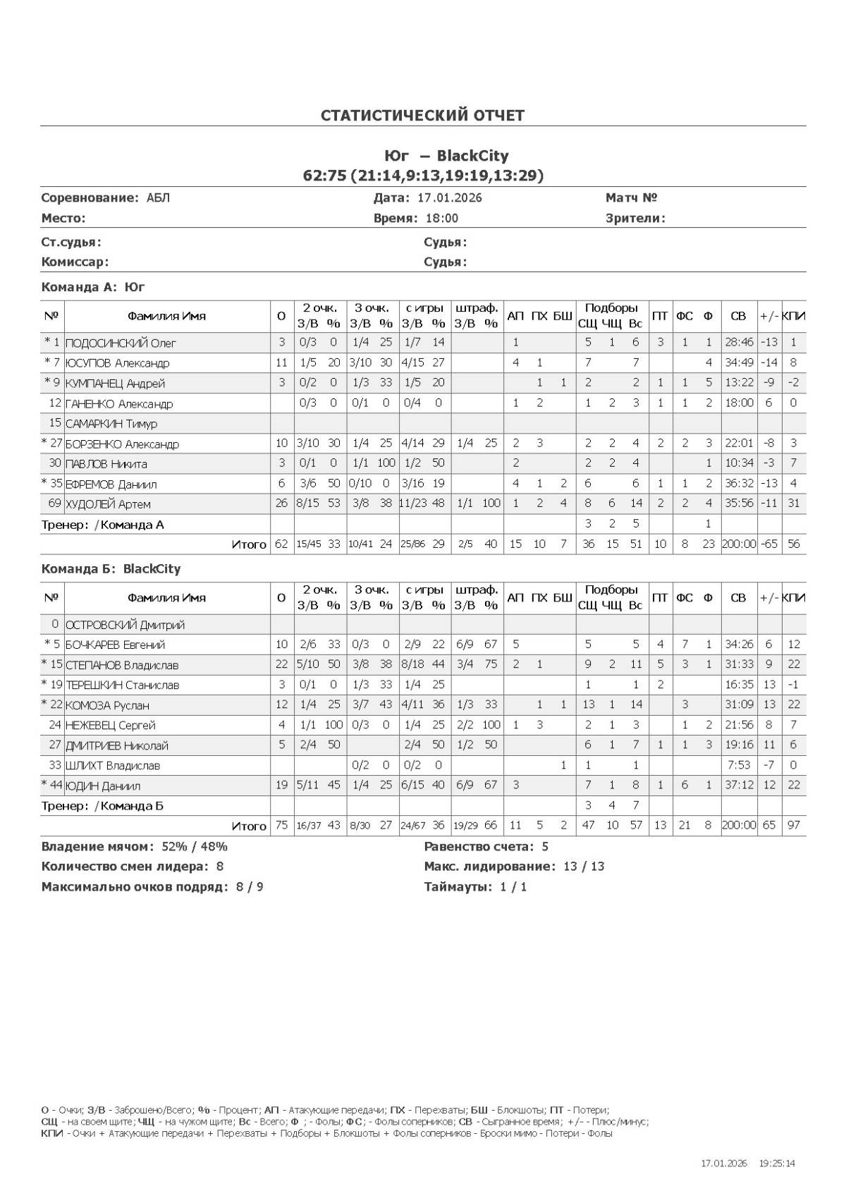 О — очки; О2 — 2-очковые (попадания/броски, %); О3 — 3-очковые; ОШ — штрафные; АП — ассисты; ПХ — перехваты; БШ — блокшоты; СЩ — подборы свой щит; ЧЩ — подборы чужой щит; ПТ — потери; Ф — фолы; ФС — фолы соперников; СВ — сыграно времени (мм:сс); +/- — плюс-минус (разница очков команды, когда игрок был на площадке); КПИ — коэффициент полезности (очки + подборы + ассисты + перехваты + блокшоты + ФС − Ф − промахи − потери).