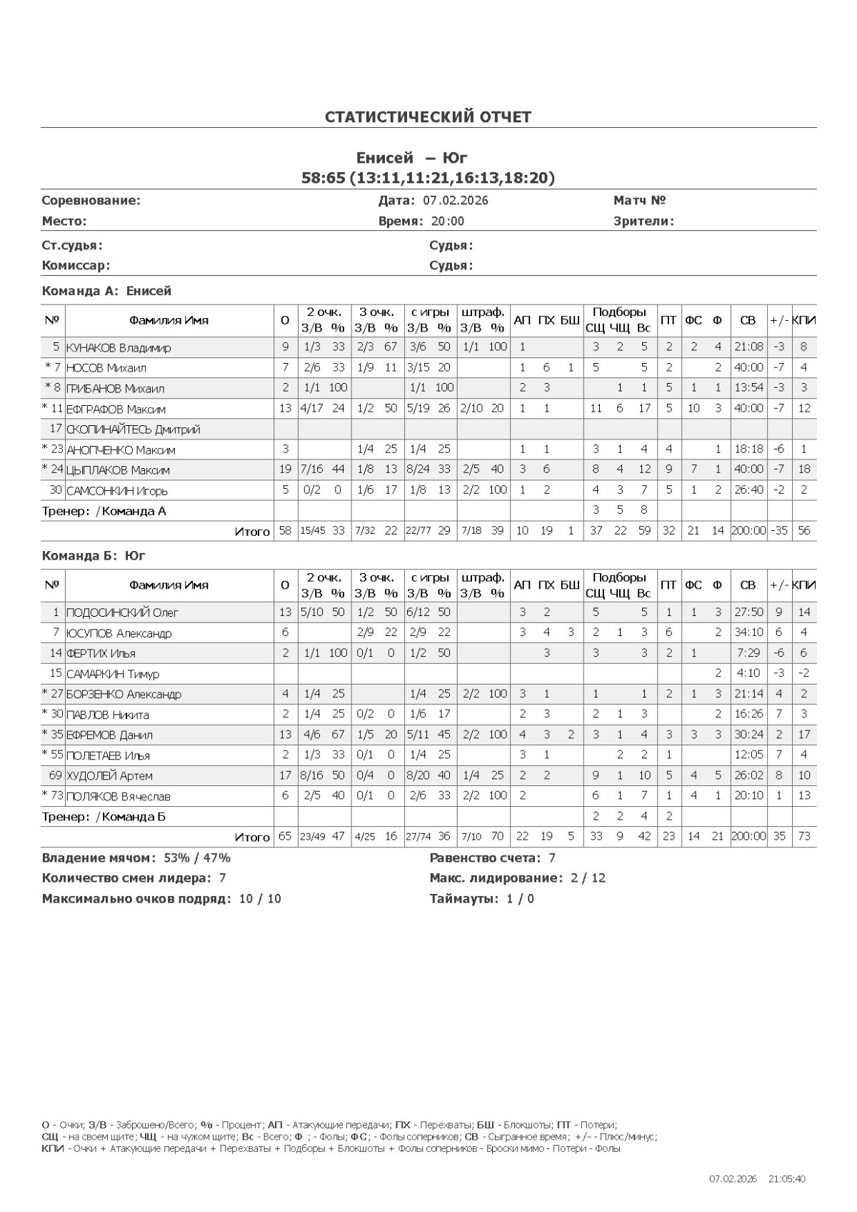 О — очки; О2 — 2-очковые (попадания/броски, %); О3 — 3-очковые; ОШ — штрафные; АП — ассисты; ПХ — перехваты; БШ — блокшоты; СЩ — подборы свой щит; ЧЩ — подборы чужой щит; ПТ — потери; Ф — фолы; ФС — фолы соперников; СВ — сыграно времени (мм:сс); +/- — плюс-минус (разница очков команды, когда игрок был на площадке); КПИ — коэффициент полезности (очки + подборы + ассисты + перехваты + блокшоты + ФС − Ф − промахи − потери).
