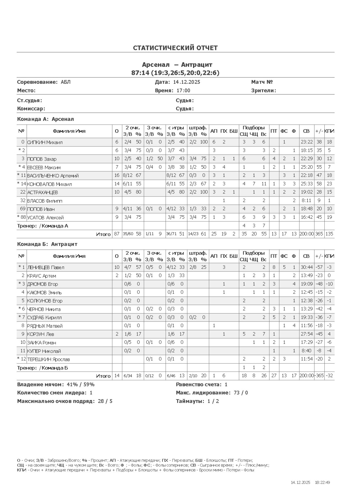 О — очки; О2 — 2-очковые (попадания/броски, %); О3 — 3-очковые; ОШ — штрафные; АП — ассисты; ПХ — перехваты; БШ — блокшоты; СЩ — подборы свой щит; ЧЩ — подборы чужой щит; ПТ — потери; Ф — фолы; ФС — фолы соперников; СВ — сыграно времени (мм:сс); +/- — плюс-минус (разница очков команды, когда игрок был на площадке); КПИ — коэффициент полезности (очки + подборы + ассисты + перехваты + блокшоты + ФС − Ф − промахи − потери).