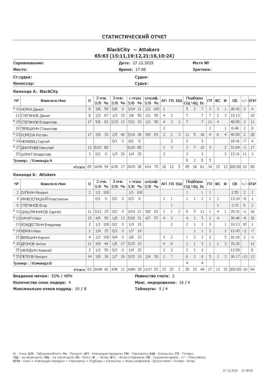 О — очки; О2 — 2-очковые (попадания/броски, %); О3 — 3-очковые; ОШ — штрафные; АП — ассисты; ПХ — перехваты; БШ — блокшоты; СЩ — подборы свой щит; ЧЩ — подборы чужой щит; ПТ — потери; Ф — фолы; ФС — фолы соперников; СВ — сыграно времени (мм:сс); +/- — плюс-минус (разница очков команды, когда игрок был на площадке); КПИ — коэффициент полезности (очки + подборы + ассисты + перехваты + блокшоты + ФС − Ф − промахи − потери).