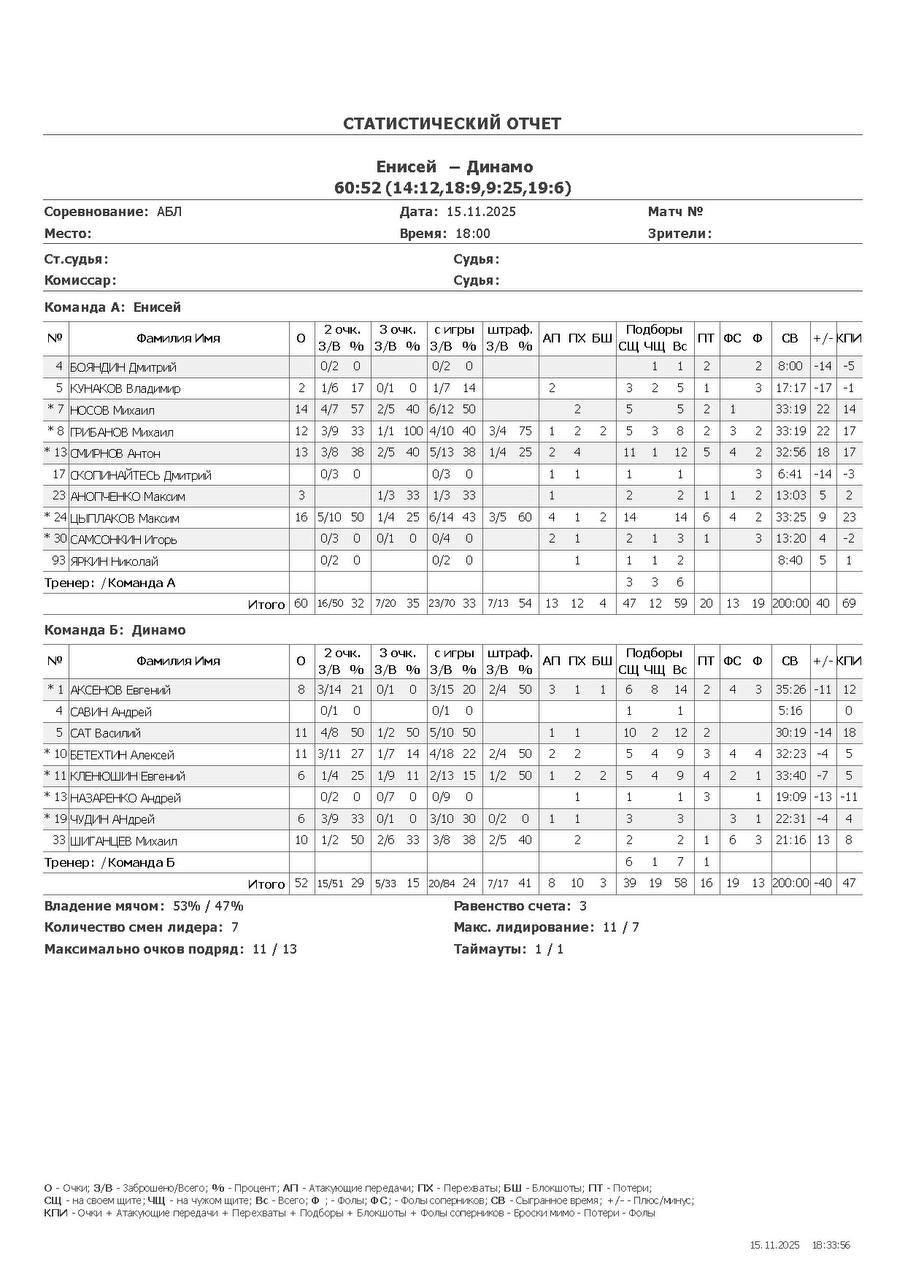 О — очки; О2 — 2-очковые (попадания/броски, %); О3 — 3-очковые; ОШ — штрафные; АП — ассисты; ПХ — перехваты; БШ — блокшоты; СЩ — подборы свой щит; ЧЩ — подборы чужой щит; ПТ — потери; Ф — фолы; ФС — фолы соперников; СВ — сыграно времени (мм:сс); +/- — плюс-минус (разница очков команды, когда игрок был на площадке); КПИ — коэффициент полезности (очки + подборы + ассисты + перехваты + блокшоты + ФС − Ф − промахи − потери).