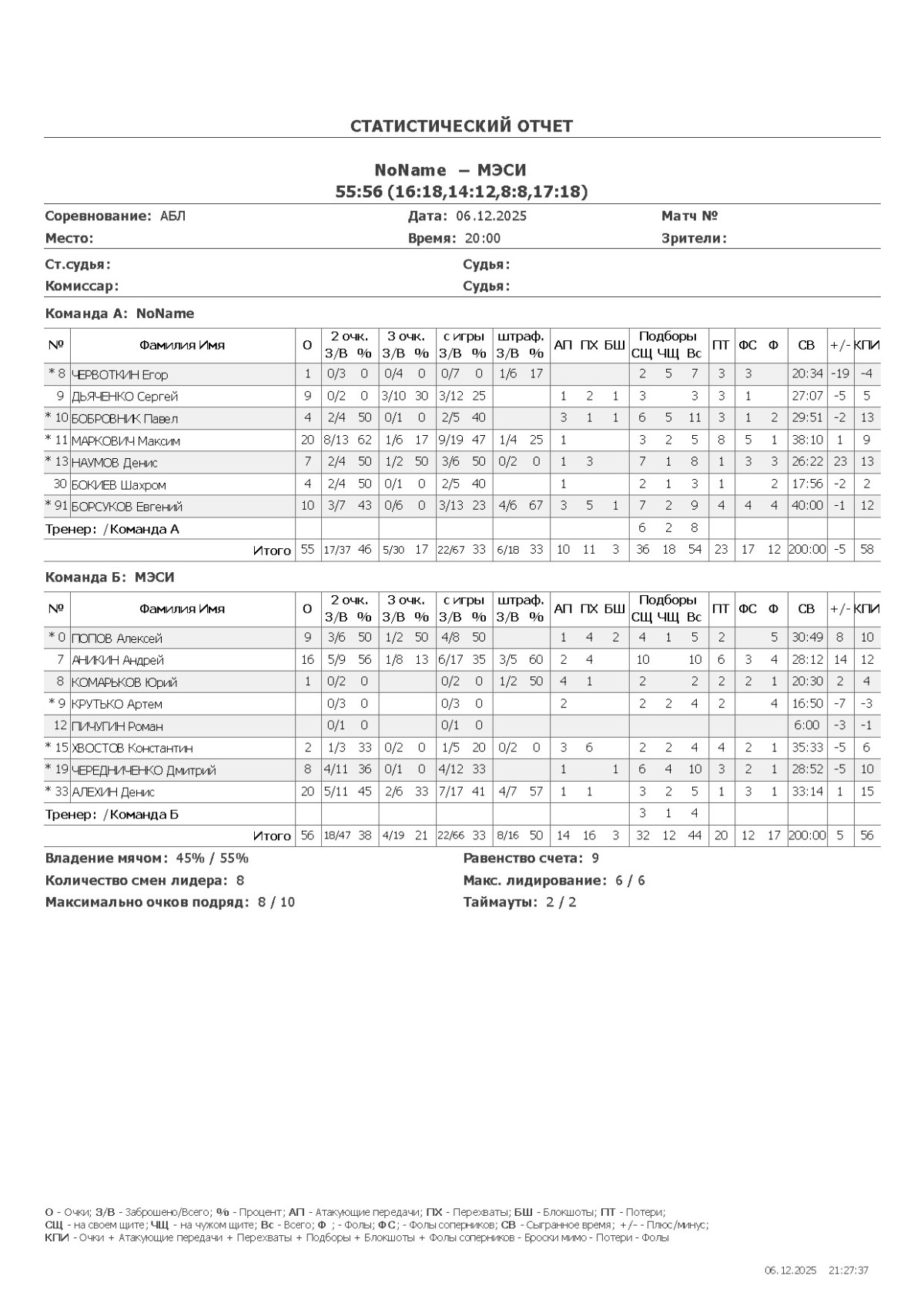 О — очки; О2 — 2-очковые (попадания/броски, %); О3 — 3-очковые; ОШ — штрафные; АП — ассисты; ПХ — перехваты; БШ — блокшоты; СЩ — подборы свой щит; ЧЩ — подборы чужой щит; ПТ — потери; Ф — фолы; ФС — фолы соперников; СВ — сыграно времени (мм:сс); +/- — плюс-минус (разница очков команды, когда игрок был на площадке); КПИ — коэффициент полезности (очки + подборы + ассисты + перехваты + блокшоты + ФС − Ф − промахи − потери).