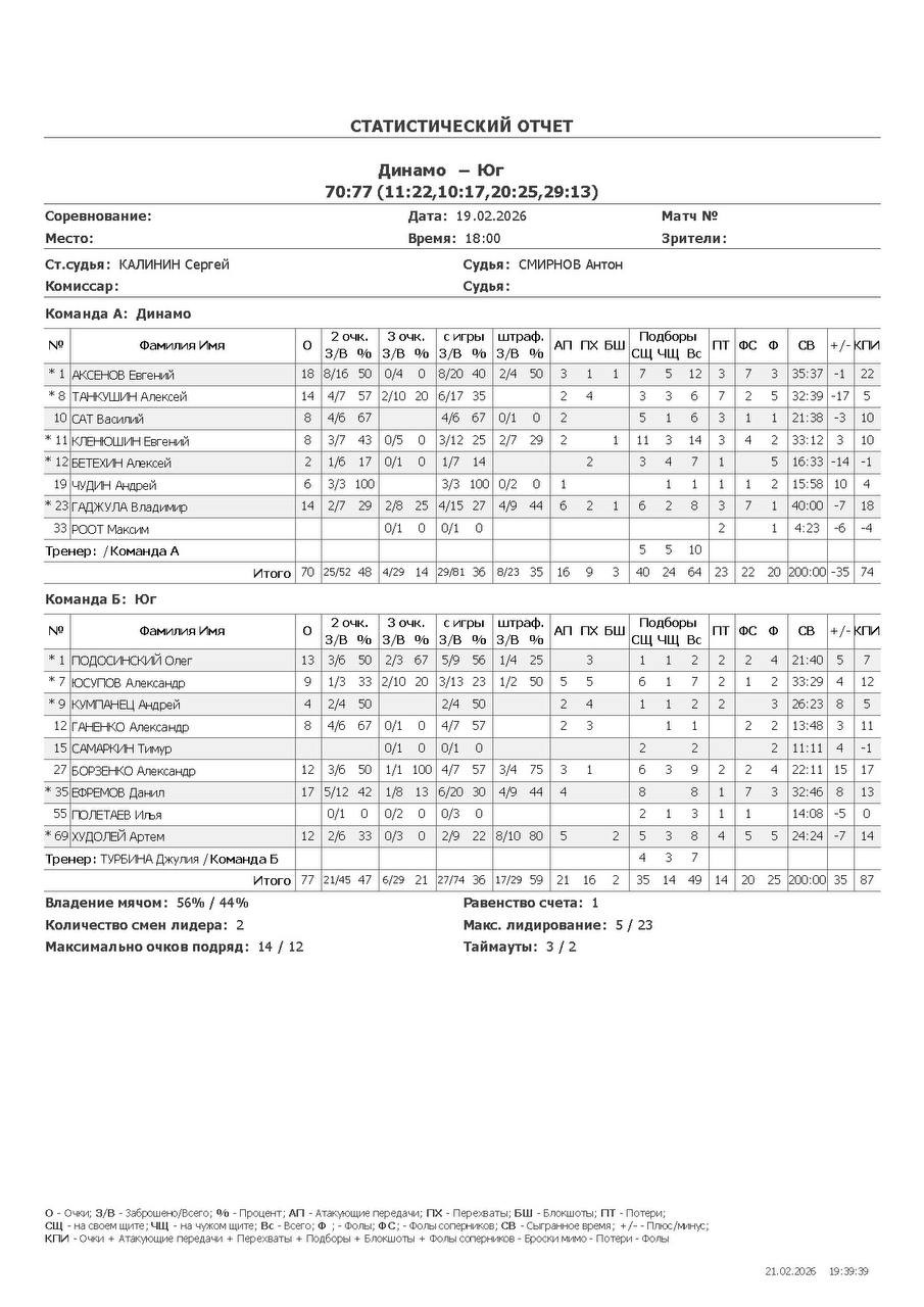 О — очки; О2 — 2-очковые (попадания/броски, %); О3 — 3-очковые; ОШ — штрафные; АП — ассисты; ПХ — перехваты; БШ — блокшоты; СЩ — подборы свой щит; ЧЩ — подборы чужой щит; ПТ — потери; Ф — фолы; ФС — фолы соперников; СВ — сыграно времени (мм:сс); +/- — плюс-минус (разница очков команды, когда игрок был на площадке); КПИ — коэффициент полезности (очки + подборы + ассисты + перехваты + блокшоты + ФС − Ф − промахи − потери).