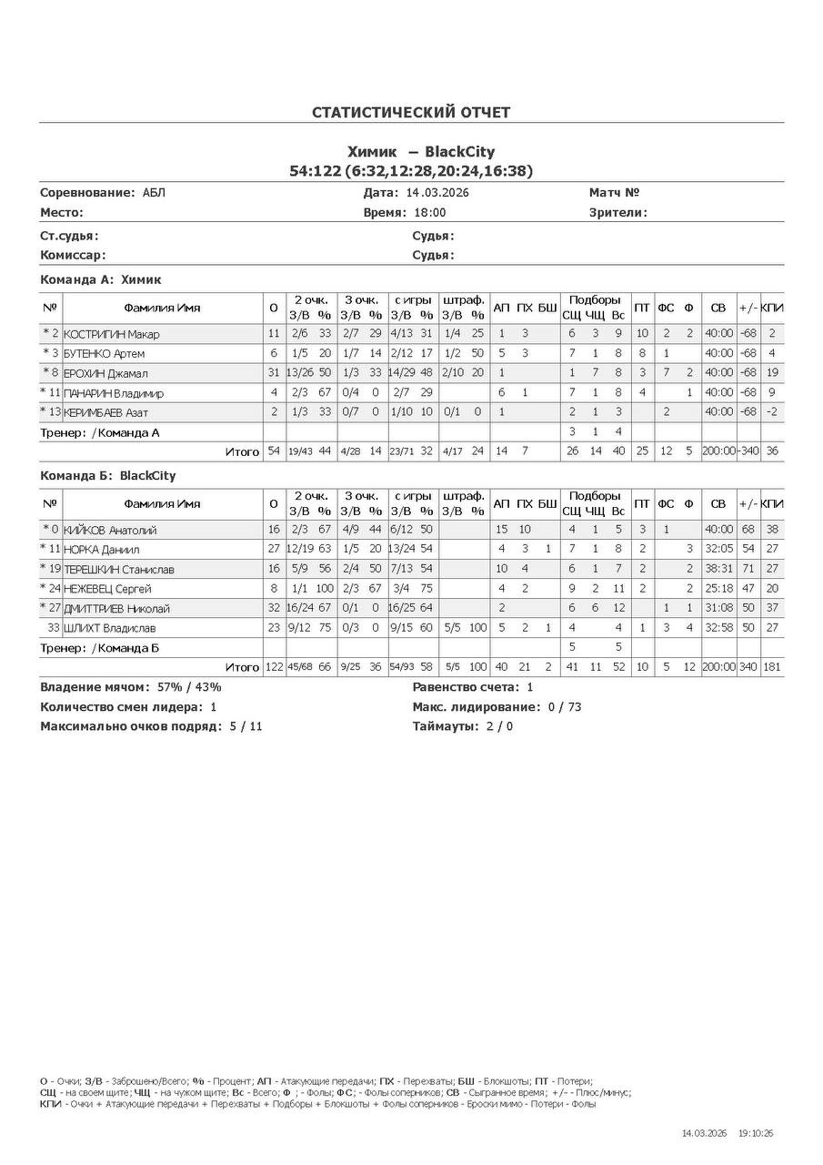 О — очки; О2 — 2-очковые (попадания/броски, %); О3 — 3-очковые; ОШ — штрафные; АП — ассисты; ПХ — перехваты; БШ — блокшоты; СЩ — подборы свой щит; ЧЩ — подборы чужой щит; ПТ — потери; Ф — фолы; ФС — фолы соперников; СВ — сыграно времени (мм:сс); +/- — плюс-минус (разница очков команды, когда игрок был на площадке); КПИ — коэффициент полезности (очки + подборы + ассисты + перехваты + блокшоты + ФС − Ф − промахи − потери).