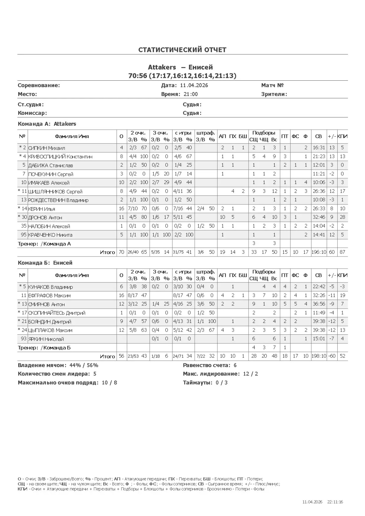 О — очки; О2 — 2-очковые (попадания/броски, %); О3 — 3-очковые; ОШ — штрафные; АП — ассисты; ПХ — перехваты; БШ — блокшоты; СЩ — подборы свой щит; ЧЩ — подборы чужой щит; ПТ — потери; Ф — фолы; ФС — фолы соперников; СВ — сыграно времени (мм:сс); +/- — плюс-минус (разница очков команды, когда игрок был на площадке); КПИ — коэффициент полезности (очки + подборы + ассисты + перехваты + блокшоты + ФС − Ф − промахи − потери).
