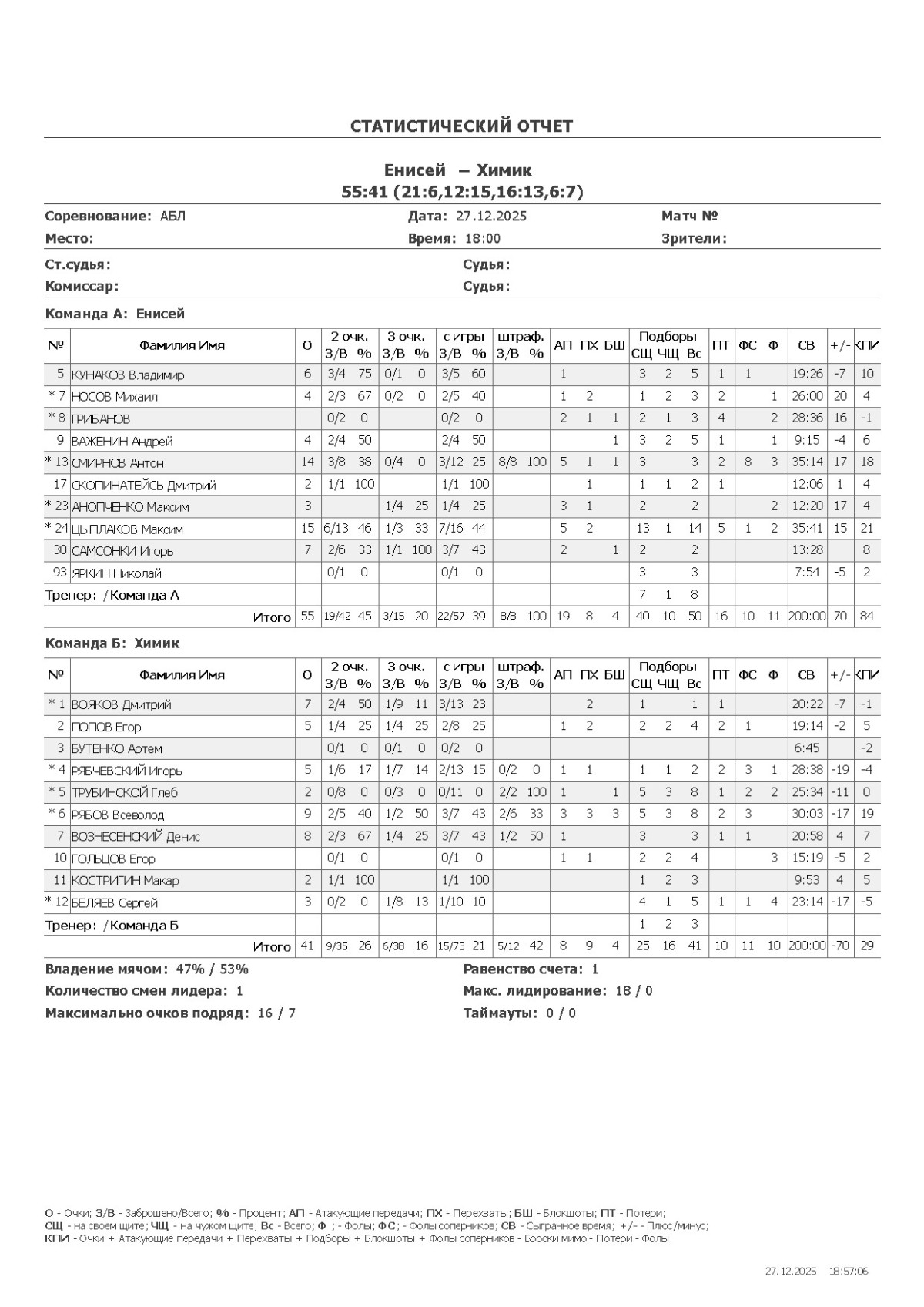 О — очки; О2 — 2-очковые (попадания/броски, %); О3 — 3-очковые; ОШ — штрафные; АП — ассисты; ПХ — перехваты; БШ — блокшоты; СЩ — подборы свой щит; ЧЩ — подборы чужой щит; ПТ — потери; Ф — фолы; ФС — фолы соперников; СВ — сыграно времени (мм:сс); +/- — плюс-минус (разница очков команды, когда игрок был на площадке); КПИ — коэффициент полезности (очки + подборы + ассисты + перехваты + блокшоты + ФС − Ф − промахи − потери).