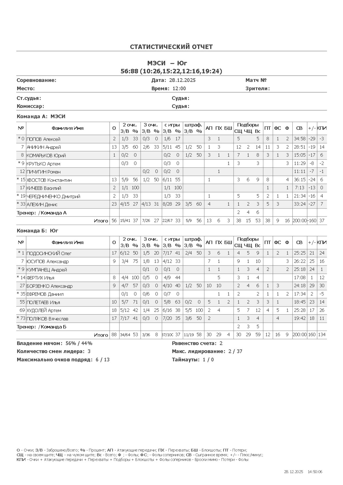 О — очки; О2 — 2-очковые (попадания/броски, %); О3 — 3-очковые; ОШ — штрафные; АП — ассисты; ПХ — перехваты; БШ — блокшоты; СЩ — подборы свой щит; ЧЩ — подборы чужой щит; ПТ — потери; Ф — фолы; ФС — фолы соперников; СВ — сыграно времени (мм:сс); +/- — плюс-минус (разница очков команды, когда игрок был на площадке); КПИ — коэффициент полезности (очки + подборы + ассисты + перехваты + блокшоты + ФС − Ф − промахи − потери).