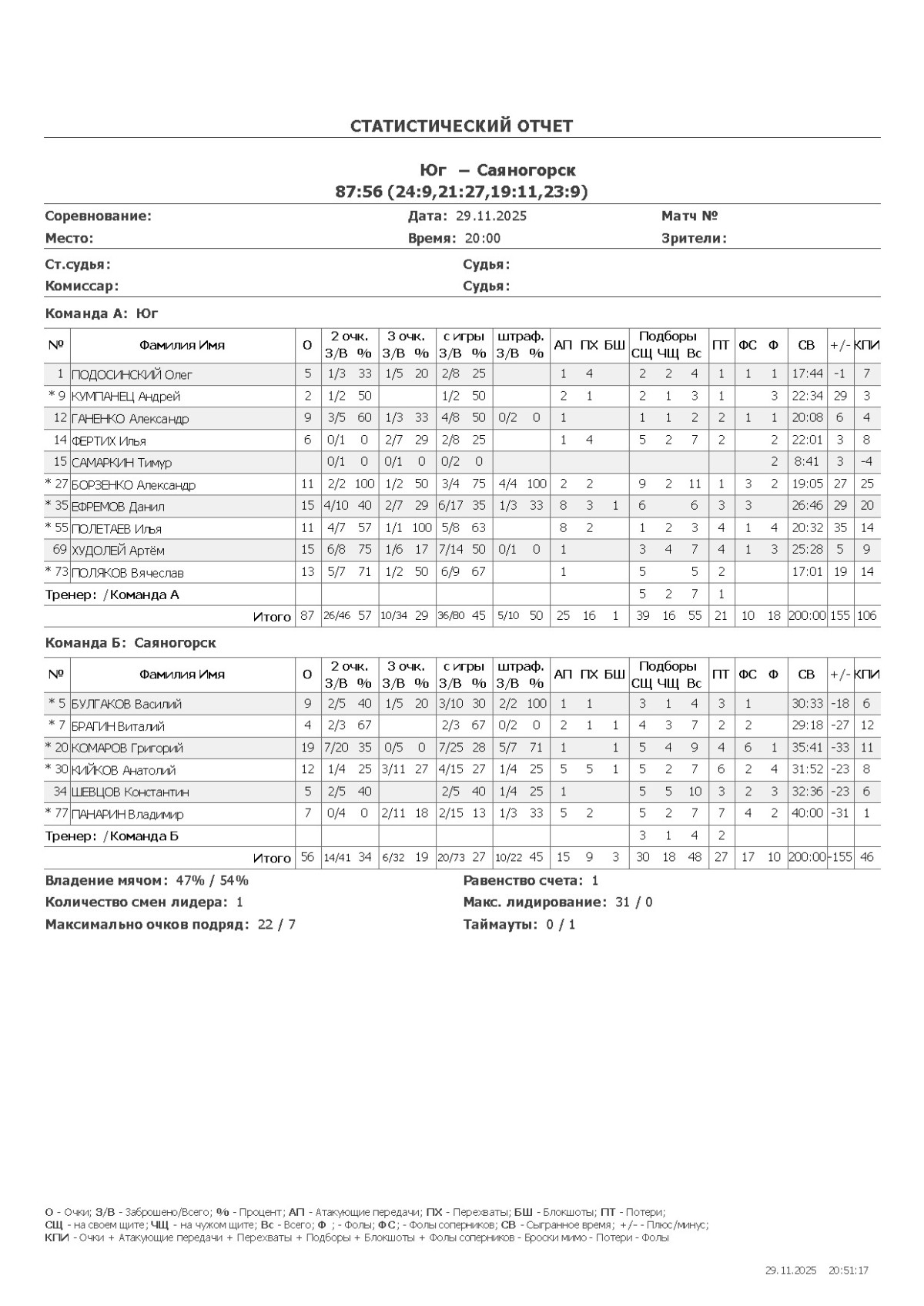 О — очки; О2 — 2-очковые (попадания/броски, %); О3 — 3-очковые; ОШ — штрафные; АП — ассисты; ПХ — перехваты; БШ — блокшоты; СЩ — подборы свой щит; ЧЩ — подборы чужой щит; ПТ — потери; Ф — фолы; ФС — фолы соперников; СВ — сыграно времени (мм:сс); +/- — плюс-минус (разница очков команды, когда игрок был на площадке); КПИ — коэффициент полезности (очки + подборы + ассисты + перехваты + блокшоты + ФС − Ф − промахи − потери).