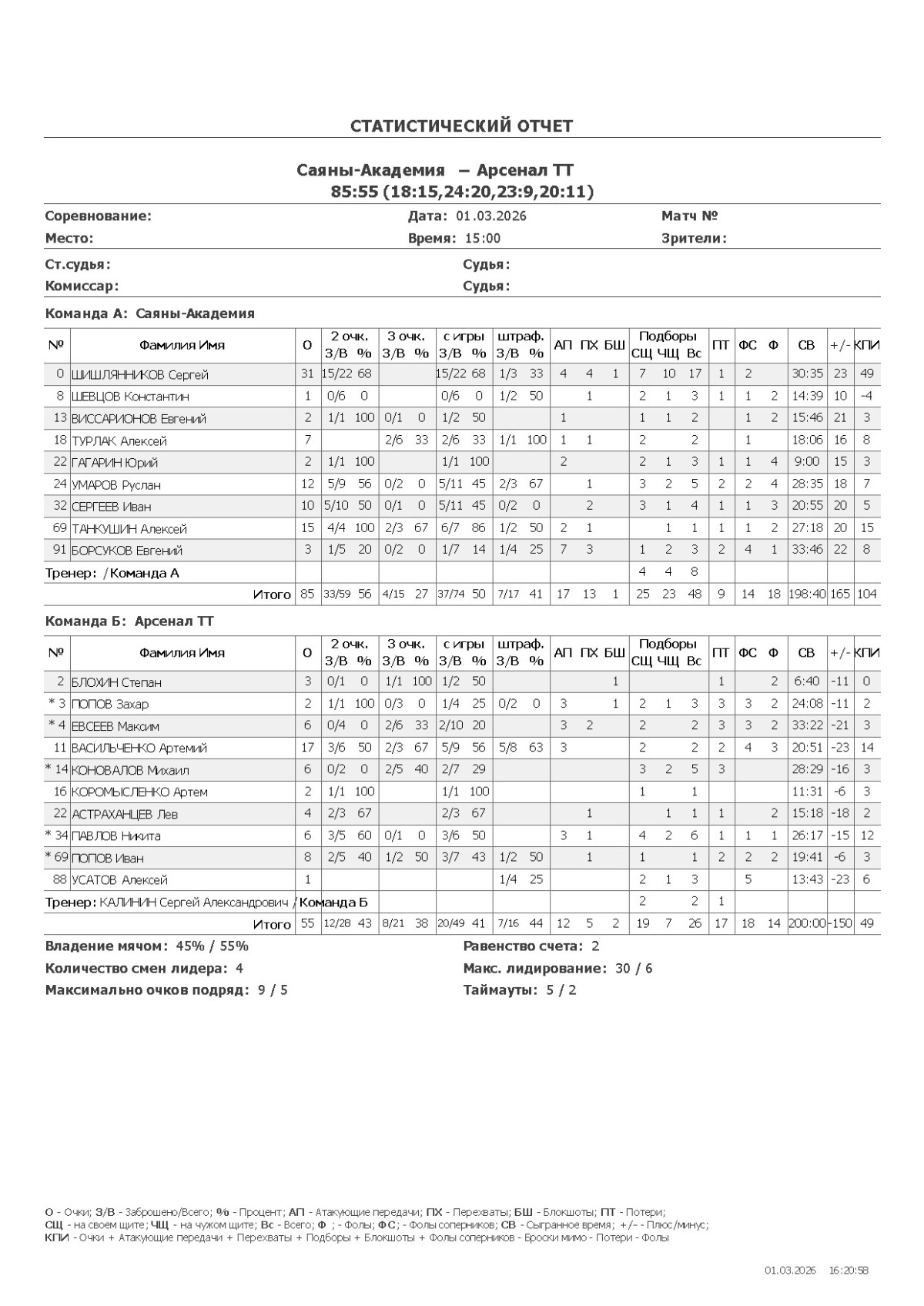 | Саяны-Академия | 18 | 24 | 23 | 20 | 85 |