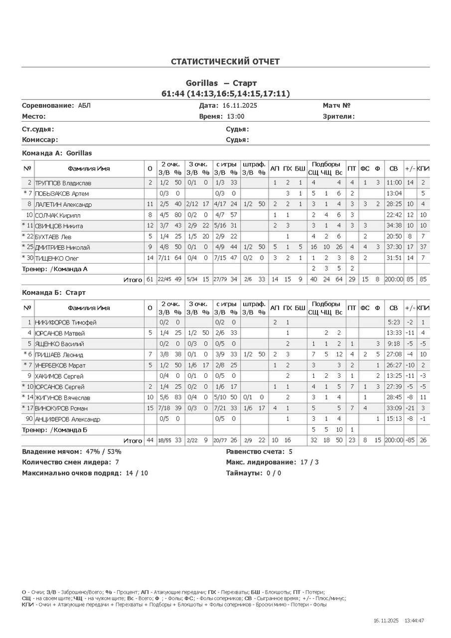 О — очки; О2 — 2-очковые (попадания/броски, %); О3 — 3-очковые; ОШ — штрафные; АП — ассисты; ПХ — перехваты; БШ — блокшоты; СЩ — подборы свой щит; ЧЩ — подборы чужой щит; ПТ — потери; Ф — фолы; ФС — фолы соперников; СВ — сыграно времени (мм:сс); +/- — плюс-минус (разница очков команды, когда игрок был на площадке); КПИ — коэффициент полезности (очки + подборы + ассисты + перехваты + блокшоты + ФС − Ф − промахи − потери).