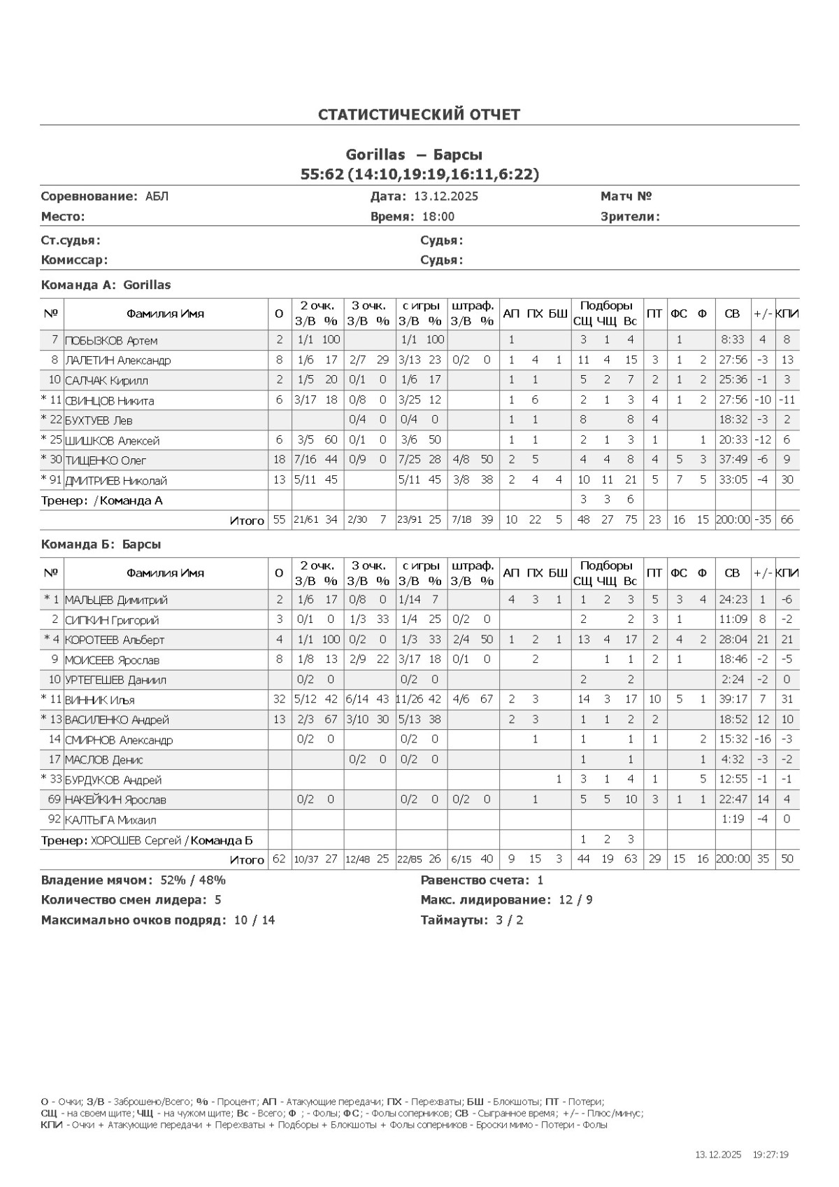 О — очки; О2 — 2-очковые (попадания/броски, %); О3 — 3-очковые; ОШ — штрафные; АП — ассисты; ПХ — перехваты; БШ — блокшоты; СЩ — подборы свой щит; ЧЩ — подборы чужой щит; ПТ — потери; Ф — фолы; ФС — фолы соперников; СВ — сыграно времени (мм:сс); +/- — плюс-минус (разница очков команды, когда игрок был на площадке); КПИ — коэффициент полезности (очки + подборы + ассисты + перехваты + блокшоты + ФС − Ф − промахи − потери).