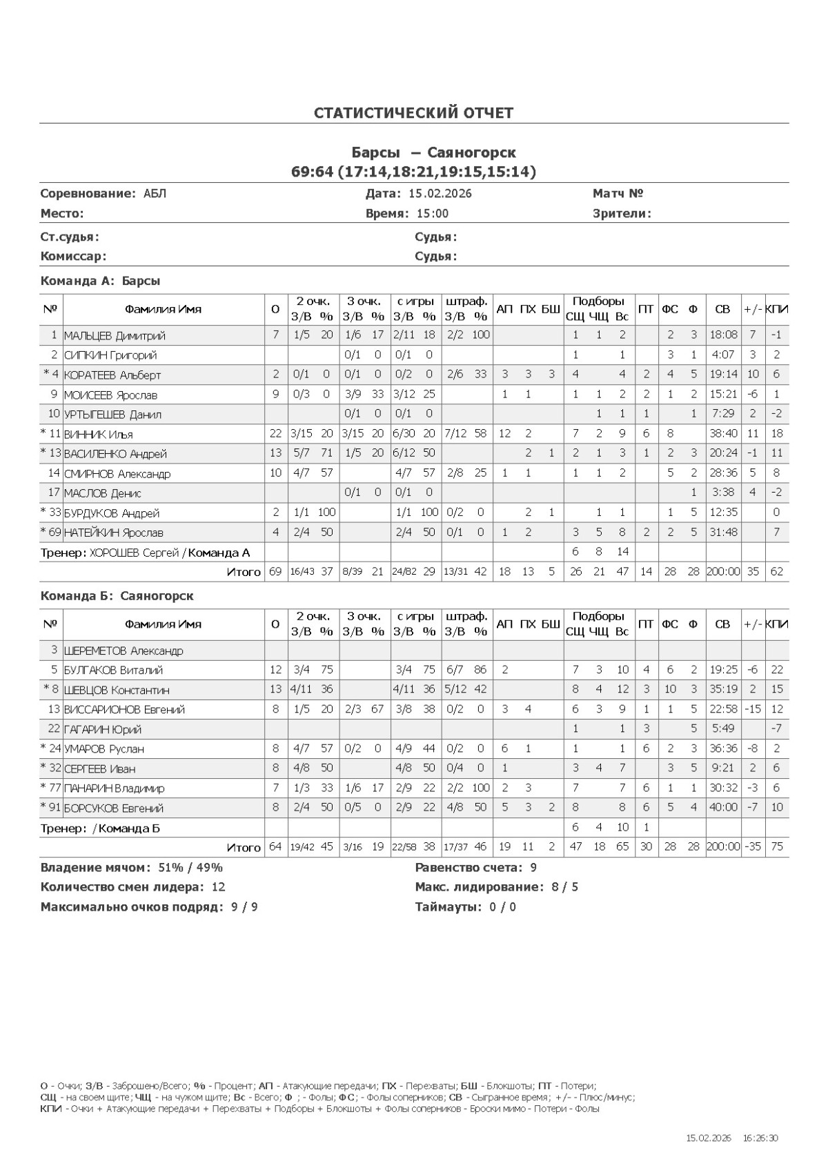 О — очки; О2 — 2-очковые (попадания/броски, %); О3 — 3-очковые; ОШ — штрафные; АП — ассисты; ПХ — перехваты; БШ — блокшоты; СЩ — подборы свой щит; ЧЩ — подборы чужой щит; ПТ — потери; Ф — фолы; ФС — фолы соперников; СВ — сыграно времени (мм:сс); +/- — плюс-минус (разница очков команды, когда игрок был на площадке); КПИ — коэффициент полезности (очки + подборы + ассисты + перехваты + блокшоты + ФС − Ф − промахи − потери).