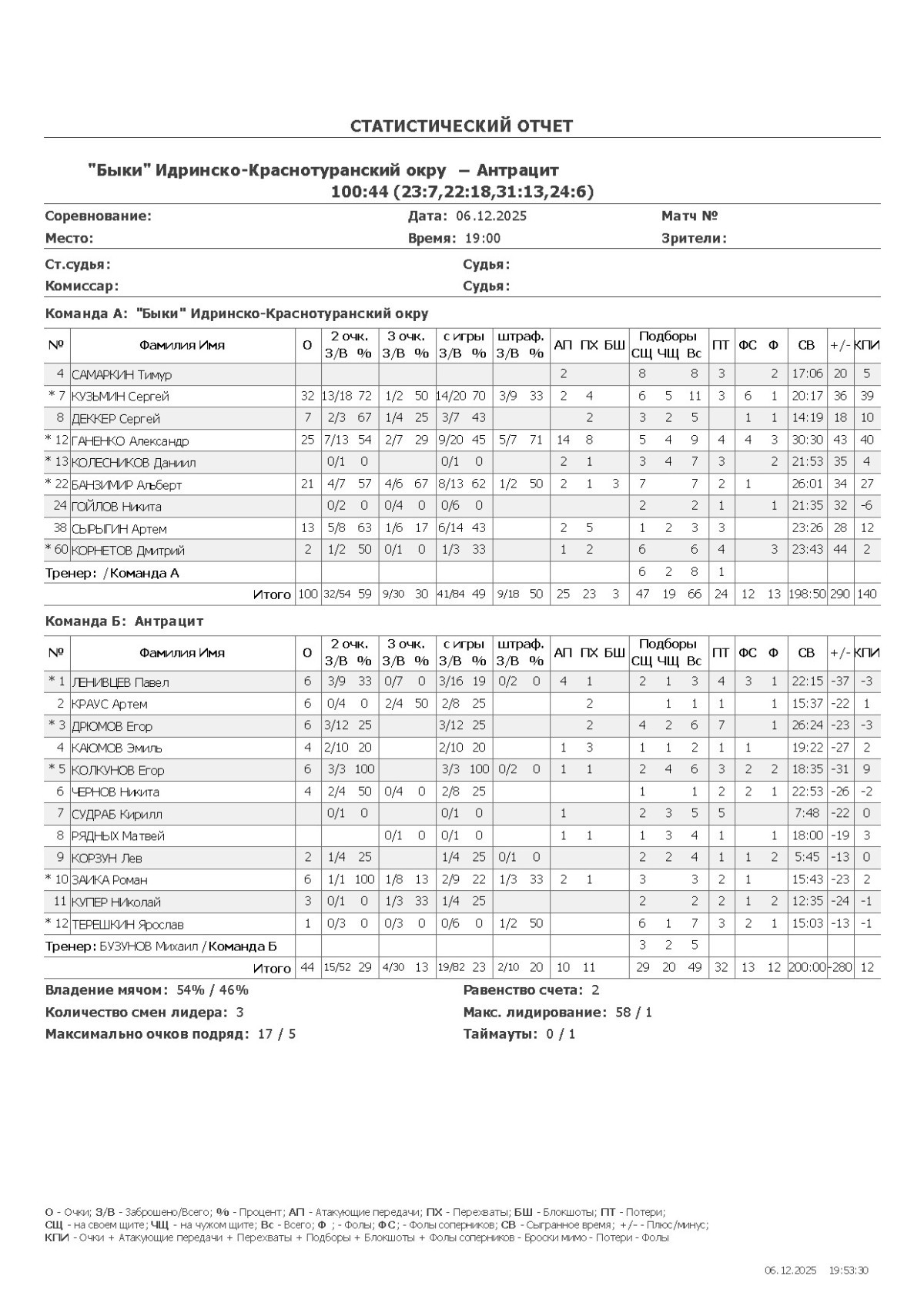 О — очки; О2 — 2-очковые (попадания/броски, %); О3 — 3-очковые; ОШ — штрафные; АП — ассисты; ПХ — перехваты; БШ — блокшоты; СЩ — подборы свой щит; ЧЩ — подборы чужой щит; ПТ — потери; Ф — фолы; ФС — фолы соперников; СВ — сыграно времени (мм:сс); +/- — плюс-минус (разница очков команды, когда игрок был на площадке); КПИ — коэффициент полезности (очки + подборы + ассисты + перехваты + блокшоты + ФС − Ф − промахи − потери).