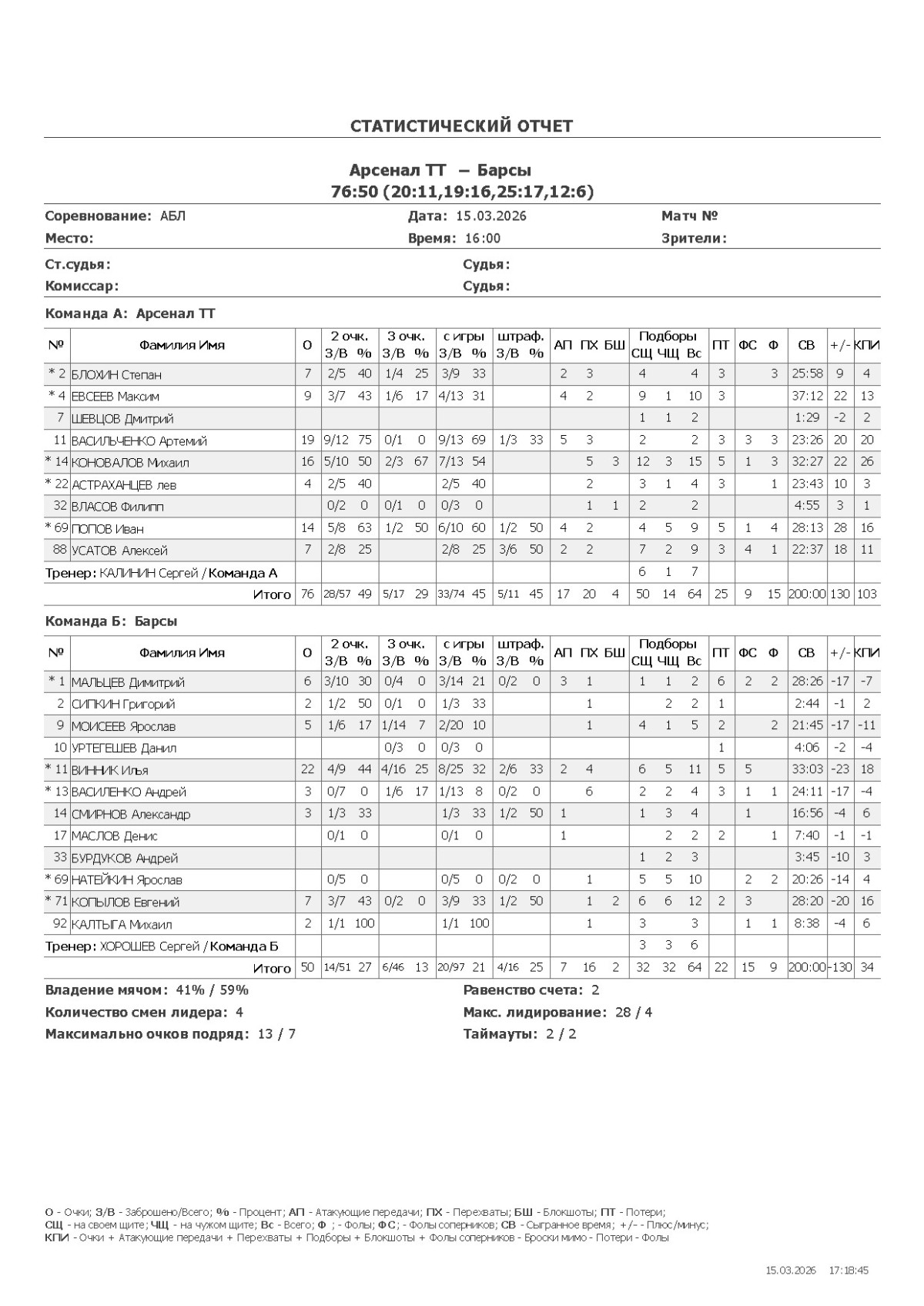 | БК Барсы | 11 | 16 | 17 | 6 | 50 |