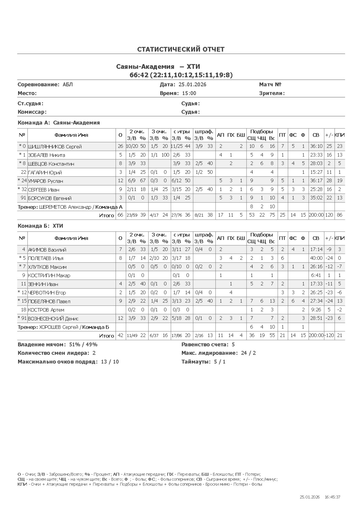 О — очки; О2 — 2-очковые (попадания/броски, %); О3 — 3-очковые; ОШ — штрафные; АП — ассисты; ПХ — перехваты; БШ — блокшоты; СЩ — подборы свой щит; ЧЩ — подборы чужой щит; ПТ — потери; Ф — фолы; ФС — фолы соперников; СВ — сыграно времени (мм:сс); +/- — плюс-минус (разница очков команды, когда игрок был на площадке); КПИ — коэффициент полезности (очки + подборы + ассисты + перехваты + блокшоты + ФС − Ф − промахи − потери).
