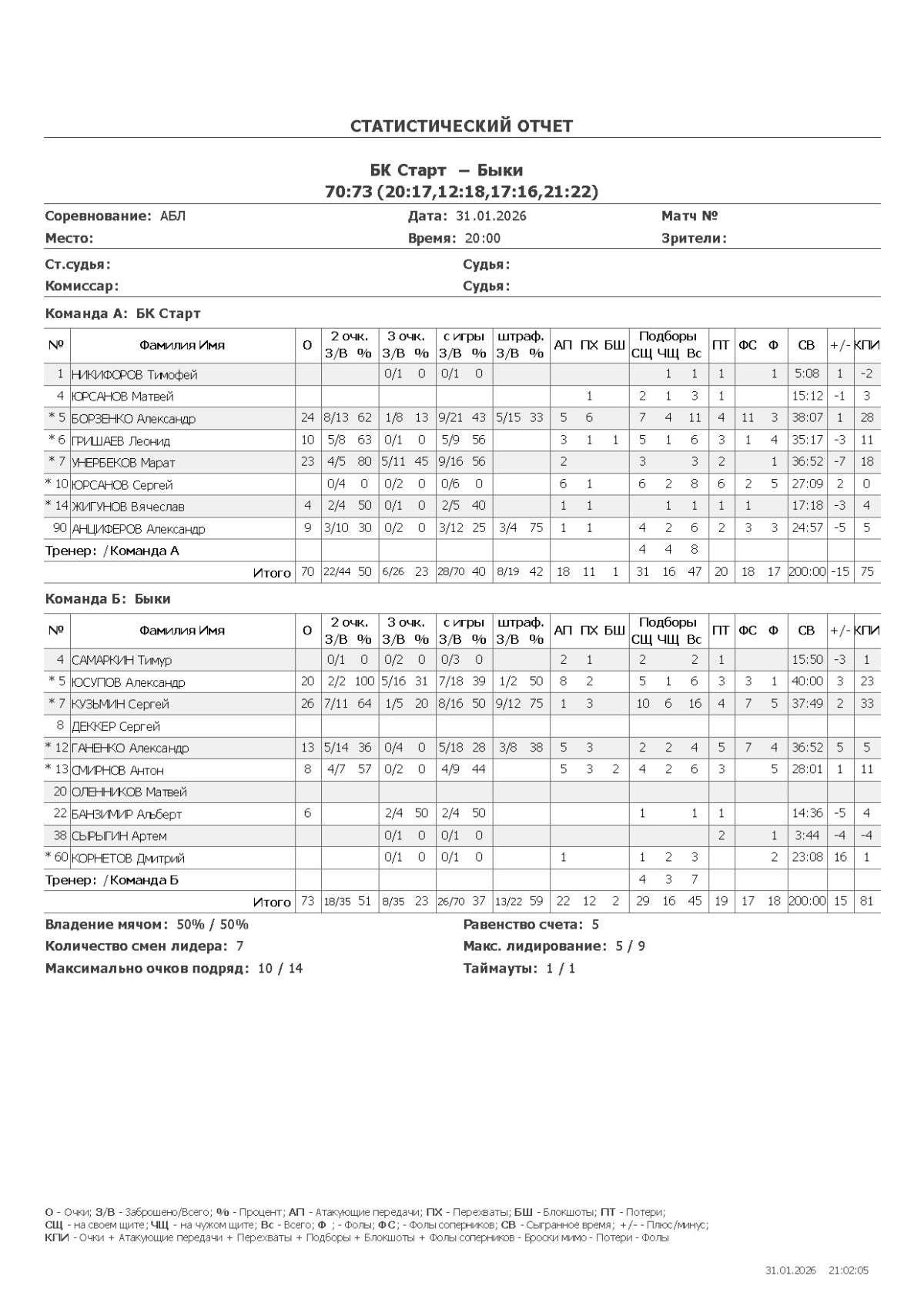 О — очки; О2 — 2-очковые (попадания/броски, %); О3 — 3-очковые; ОШ — штрафные; АП — ассисты; ПХ — перехваты; БШ — блокшоты; СЩ — подборы свой щит; ЧЩ — подборы чужой щит; ПТ — потери; Ф — фолы; ФС — фолы соперников; СВ — сыграно времени (мм:сс); +/- — плюс-минус (разница очков команды, когда игрок был на площадке); КПИ — коэффициент полезности (очки + подборы + ассисты + перехваты + блокшоты + ФС − Ф − промахи − потери).