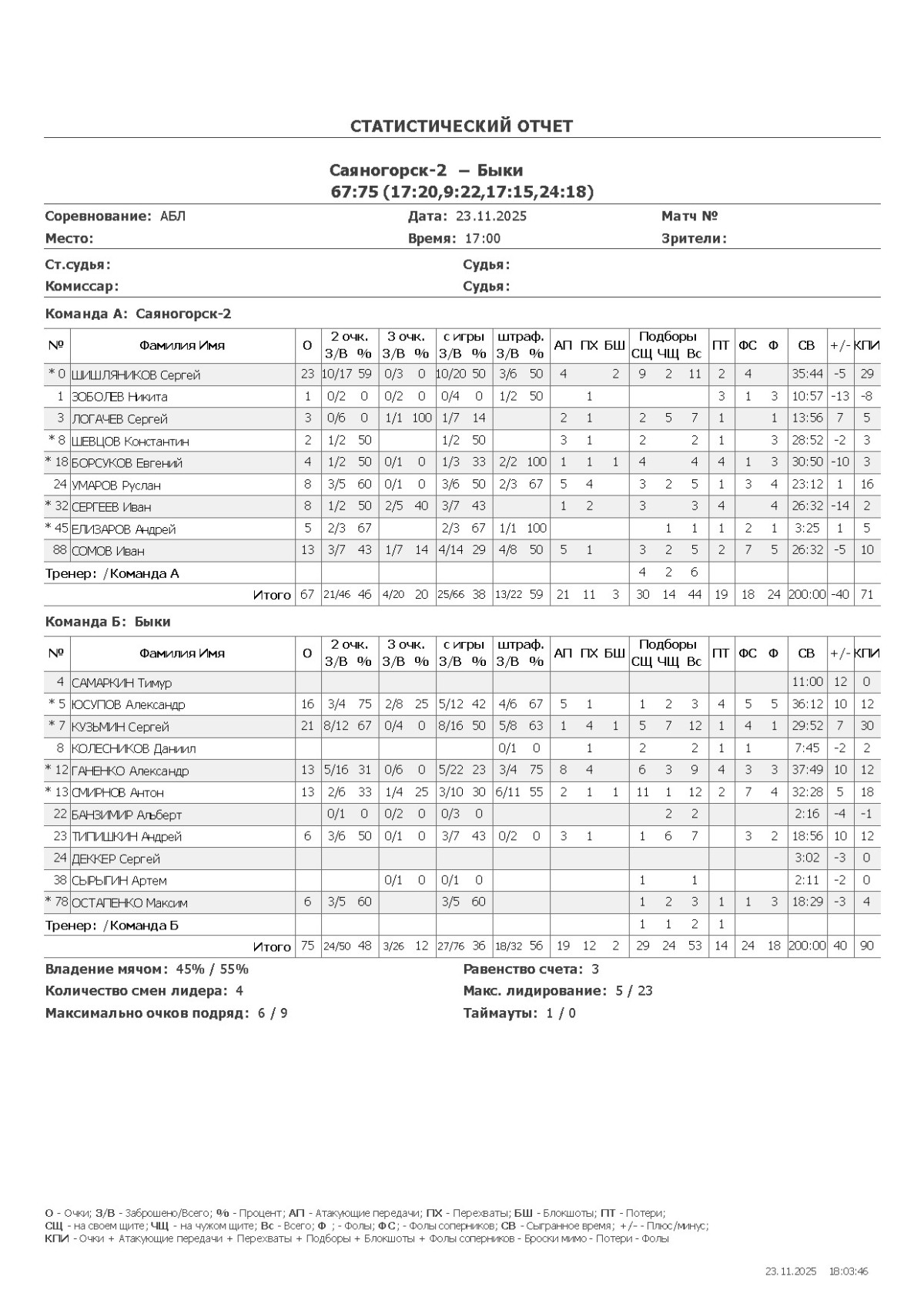| 24 | Умаров Руслан | 8 | 3/5 60% | 0/1 0% | 2/3 67% | 5 | 4 | 0 | 3 | 2 | 1 | 3 | 4 | 23:12 | +1 | 16 |