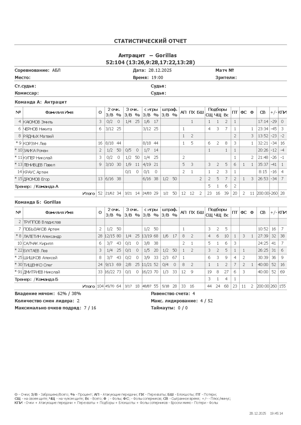 О — очки; О2 — 2-очковые (попадания/броски, %); О3 — 3-очковые; ОШ — штрафные; АП — ассисты; ПХ — перехваты; БШ — блокшоты; СЩ — подборы свой щит; ЧЩ — подборы чужой щит; ПТ — потери; Ф — фолы; ФС — фолы соперников; СВ — сыграно времени (мм:сс); +/- — плюс-минус (разница очков команды, когда игрок был на площадке); КПИ — коэффициент полезности (очки + подборы + ассисты + перехваты + блокшоты + ФС − Ф − промахи − потери).